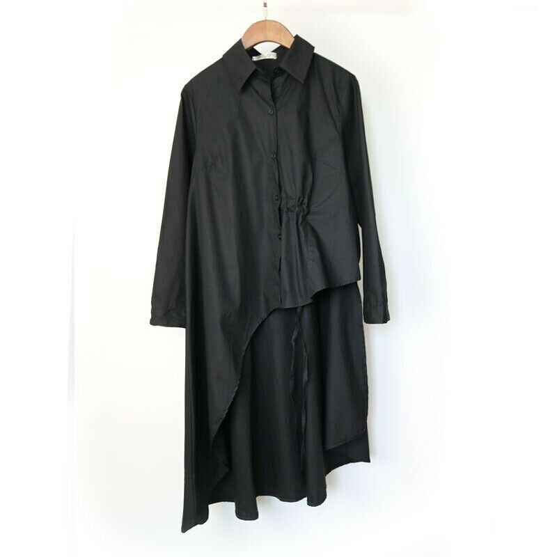 【商品説明】 フロントは従来のボタン式で、右側へ長くアシンメトリーに変形したデザインシャツです。 左側はその長さをより細身で綺麗に演出できるよう丈の長さはウエストまでに抑えて メリハリを意識したスタイリッシュさに加えて、チャームポイントしてリボン帯が付与されています。 軽やかなコットン素材で縫製された生地感はカジュアルかつシックな雰囲気を醸し出しています。 ボディの生地感と同様のカラーボタンを採用することで全体の統一感を高め、 モード・キレイ目、ジーンズ等のカジュアルといった様々なスタイリングにいかがでしょうか。 【素材】ポリエステル:80% コットン:20% 【サイズ寸法】 ◾️肩幅:37cm ◾️胸囲:94cm ◾️袖丈:55cm ◾️総丈:59-104cm